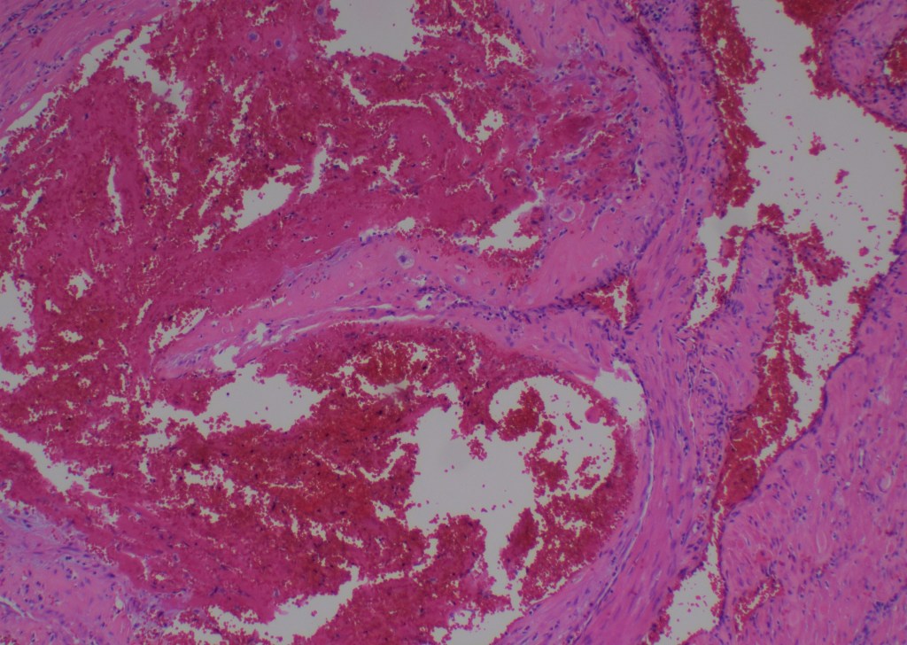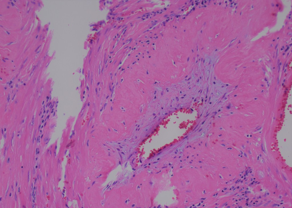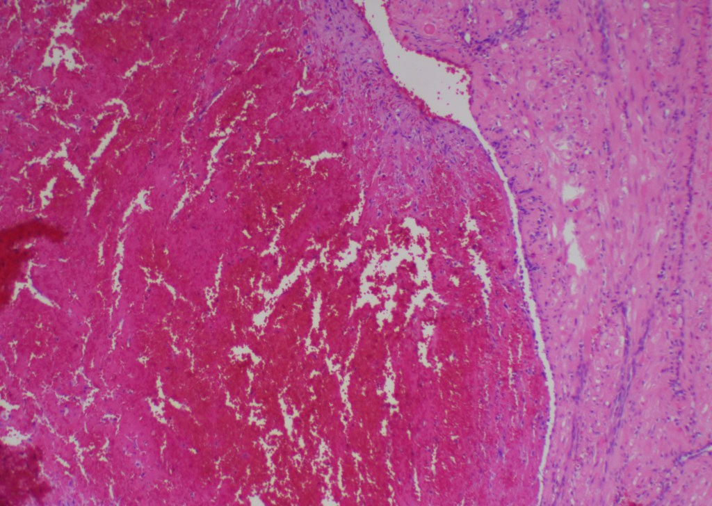 Delayed postpartum hemorrhage is likely to be associated with a pathologic process and one of the reasons I see once or twice a year is a subinvolution of the placental site. It is easy to recognize and yet it can be missed if the pathologist does not think about this entity. After delivery contraction of myometrium closes the arteries and stops the bleeding. The arteries and veins in the implantation site go through a series of changes such as hyalinization, inflammation, intimal proliferation, and organized thrombi.