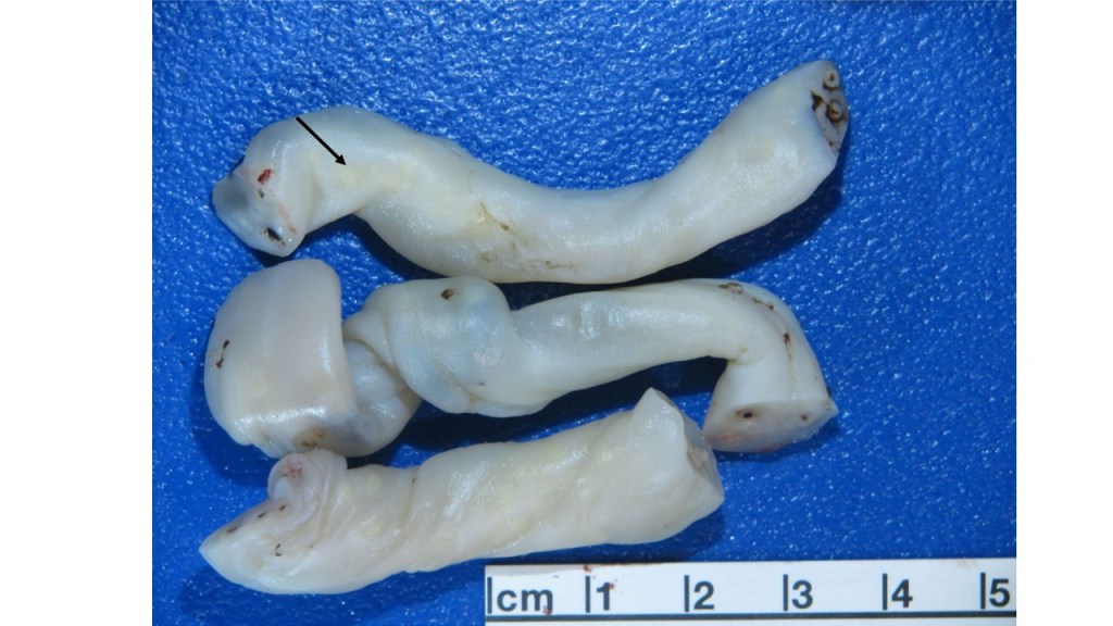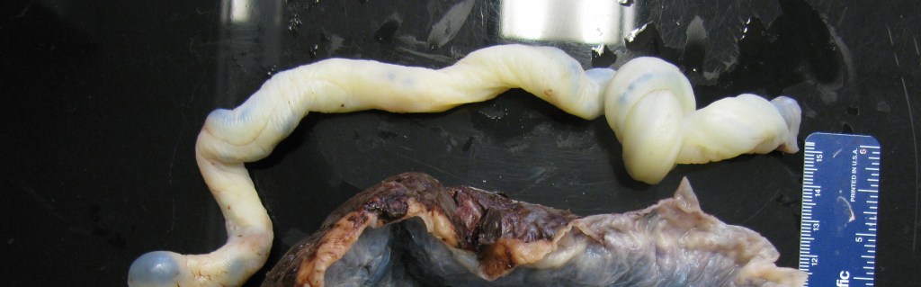 - Cross-section of the umbilical cord usually reveals three (3) blood vessels (two umbilical arteries and one umbilical vein). If only two vessels are noted then the finding of the single umbilical artery should always be documented closer to the fetal end of the cord. Umbilical arteries tend to have anastomoses (Hyrtl’s anastomoses) and they tend to fuse little bit closer to the fetal end. The other finding that can be grossly examined is the presence or absence of thrombotic lesions in the umbilical vessels. The thrombotic lesions present as little white-tan plugs in the umbilical vessels. It is very important to document these. Presence of thrombosis in the umbilical cord is associated with fetal thrombotic lesions and with intrauterine fetal demise and intrauterine fetal growth restriction.