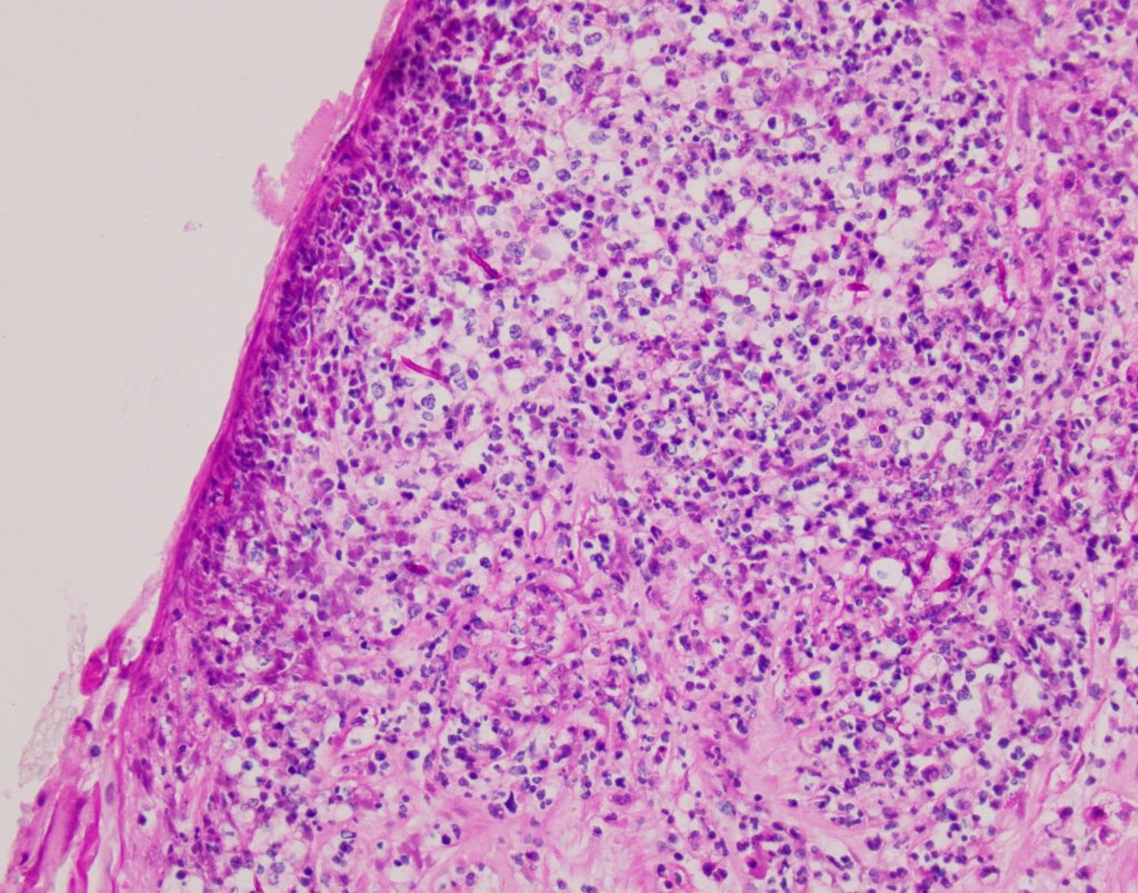 - Microscopically: the most common finding is inflammation of the umbilical cord (funisitis). Funisitis represents fetal response and may involve only umbilical vein or all three blood vessels with the spillage into Wharton’s jelly. If the acute information is reaching the surface of the umbilical cord, one should think about candida infection and perform special stains to highlight potential fungal microorganisms. Many times grossly described white lesions may correspond with squamous metaplasia of the amniotic epithelium.