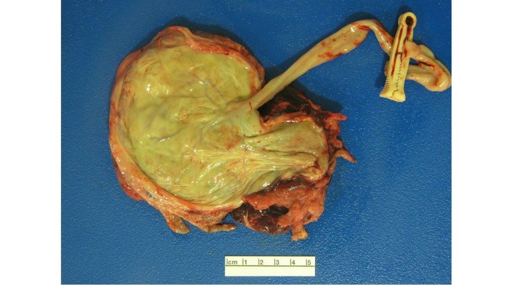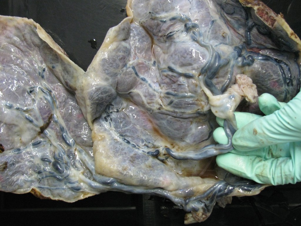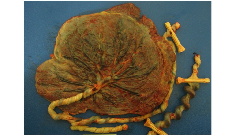 - Length: the first thing to document while grossing the placenta is the length of the umbilical cord. About 1-2% of all umbilical cords will be less than 35 cm and those should be considered as a short cord (is the entire length of the cord was submitted). The short cord can be correlated with neonatal problems that may include placental abruption, cord hematoma, and, cord rupture. The long cord is longer than 70 to 80 cm. The long umbilical cord or excessively long umbilical cords can be associated with cord prolapse, cord entanglements, true knots, excessive coiling, or thrombosis due to entanglements many times. Clinical associations of the long cords include neurologic impairment, intrauterine fetal demise or growth restrictions; therefore, it is important to document it and correlate with clinical history.